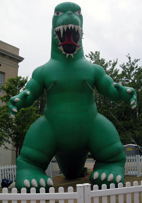 Godzilla-Downtown-DecaturPresiding over book-related activities at the AJC-Decatur Book Festival will be this tracemaker, which is very likely a close relative of T. rex, but with possible shared ancestry with Bookzilla. What’s with the wires? Don’t ask.